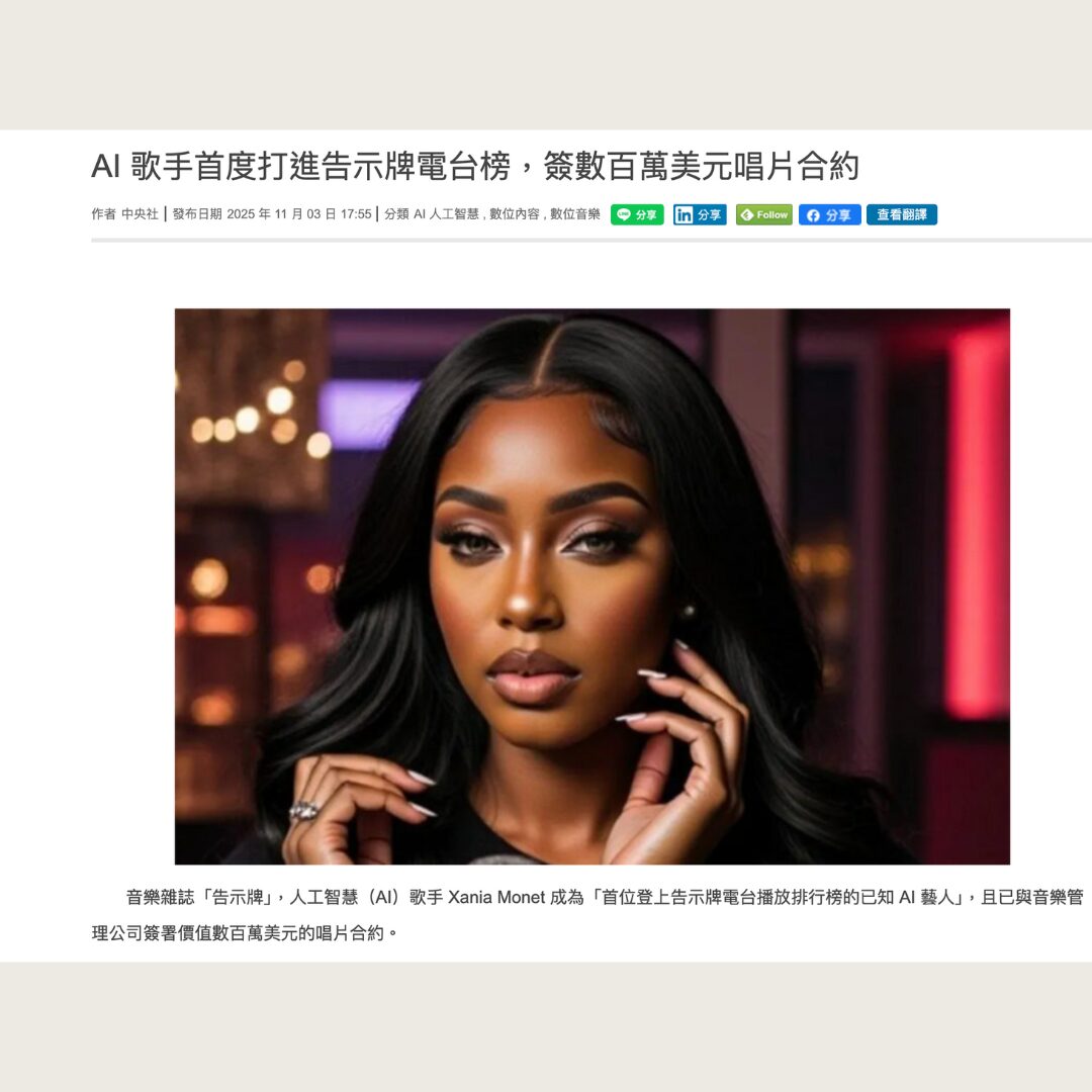 美國一位叫Monet 的AI女歌手,推出的R&B單曲,一經發布,在各大社群平台上瞬間爆紅,馬上有唱片公司還跟她簽了300萬美金合約。