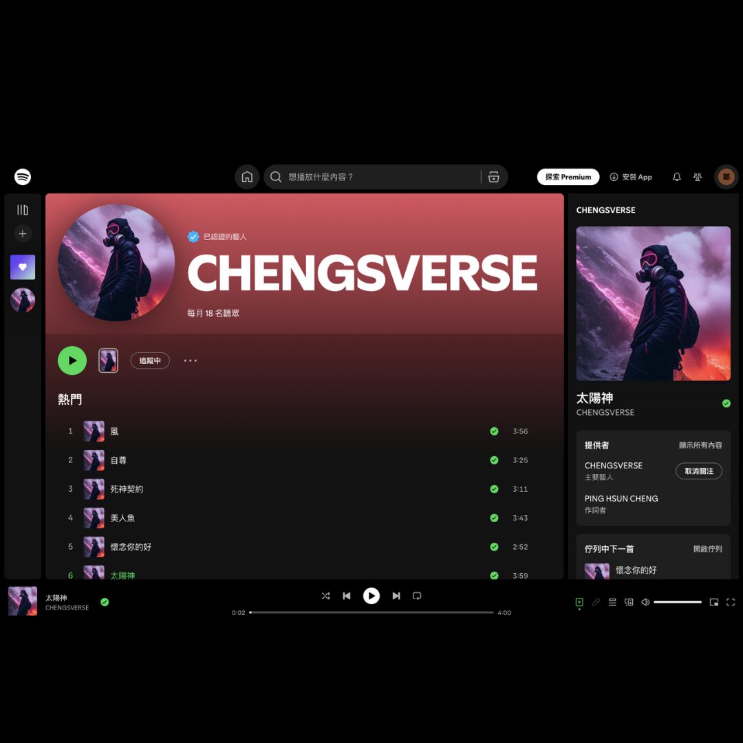 透過這套 AI 系統,在 一個月內 完成創作音樂的夢想 成功發行多張專輯,並獲得 Spotify 認證音樂人 身份 6個月內,已經成功發佈超過 640首中英文歌曲。